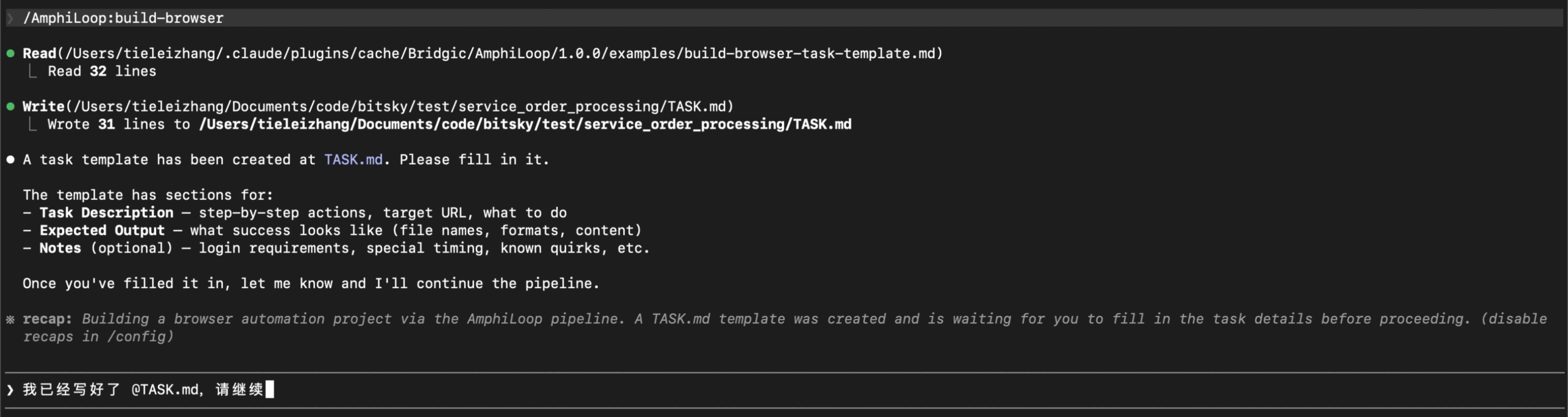 orders.json文件,还提到了这个文件中某些可以用于校验的状态。写好TASK.md后,告知Claude Code已经完成:
