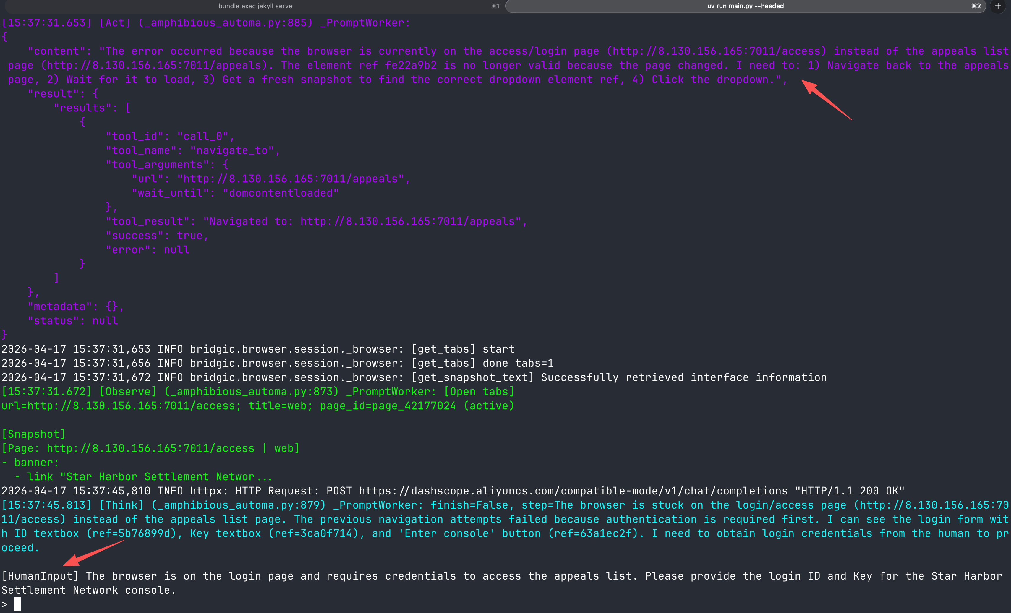 amphiflow发现了错误,然后通过进一步「观察」(在这个例子中是get_snapshot_text),推理出实际发生了什么状况。然后它发现当前被弹出到登录页了,需要进行身份验证 (“authentication is required first”),于是它决策下一步发起一个human-in-the-loop来让人帮它登录。
