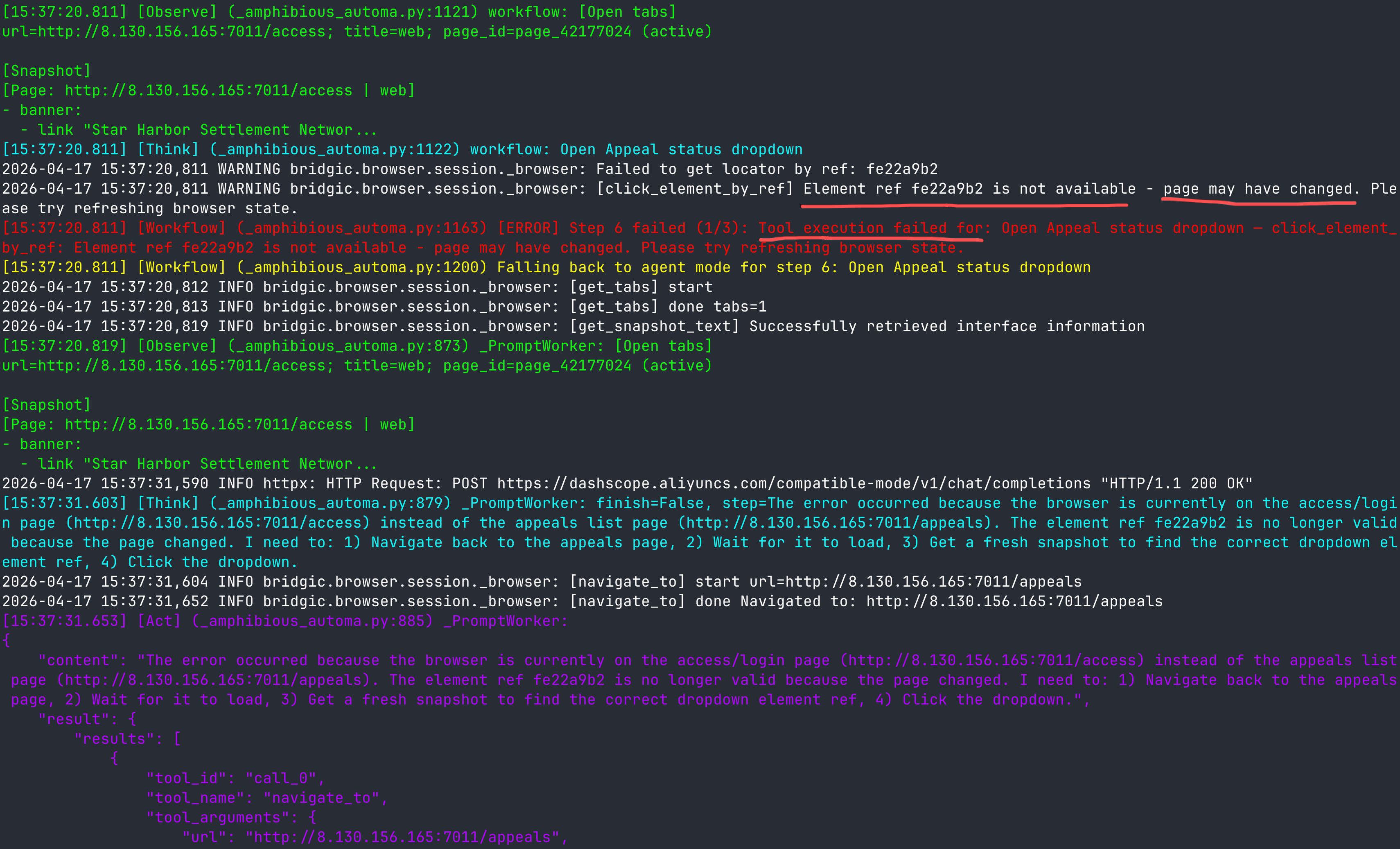 假设一个浏览器自动化程序正在访问并操作某个网页。在正常情况下,由于浏览器保持了登录状态,一切操作正常。但是,如果一旦登录状态过期,程序就可能会发生预期外的错误。这个时候,如果是普通的workflow程序,程序就会报错退出了。但一个amphiflow程序会启动切换到agent模式,下面是一个实际运行的例子: