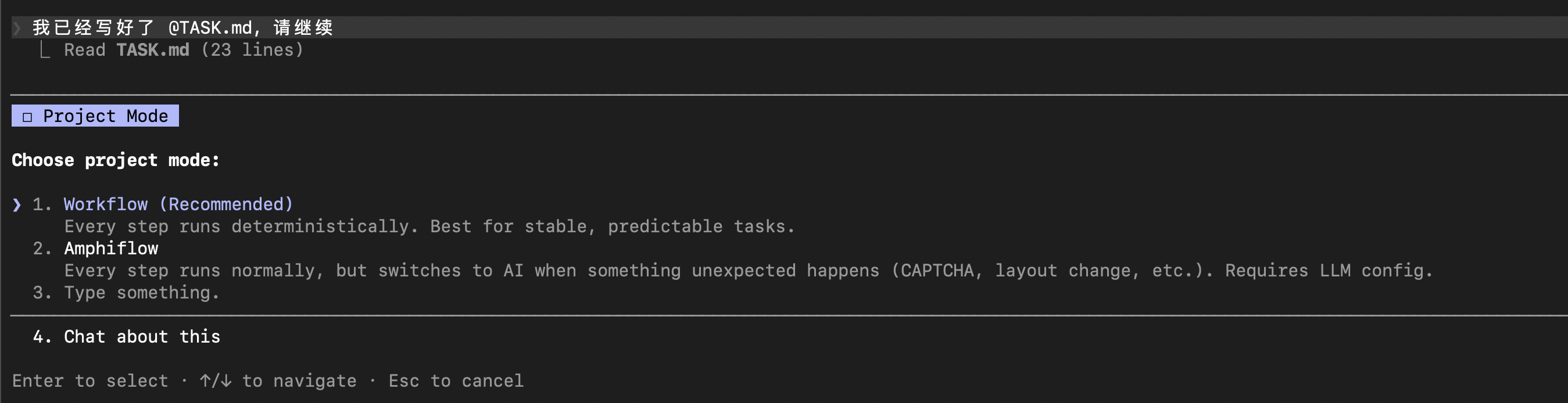 具备这个能力的前提是,我们在前面「工程模式」的选项中选择了Amphiflow。这样的话,当AmphiLoop整个构建过程完成后,产出的就不是普通的workflow程序,而是一种全新的amphiflow程序。