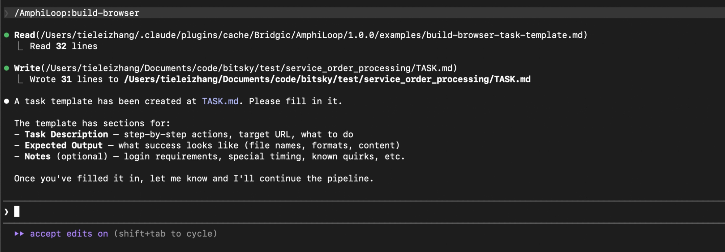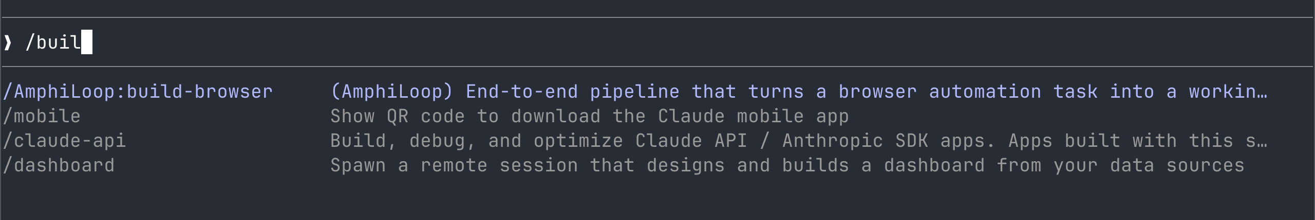 上手使用AmphiLoop很简单,只需要在Claude Code中手敲 /build-browser命令,系统会提示出完整命令,如下: