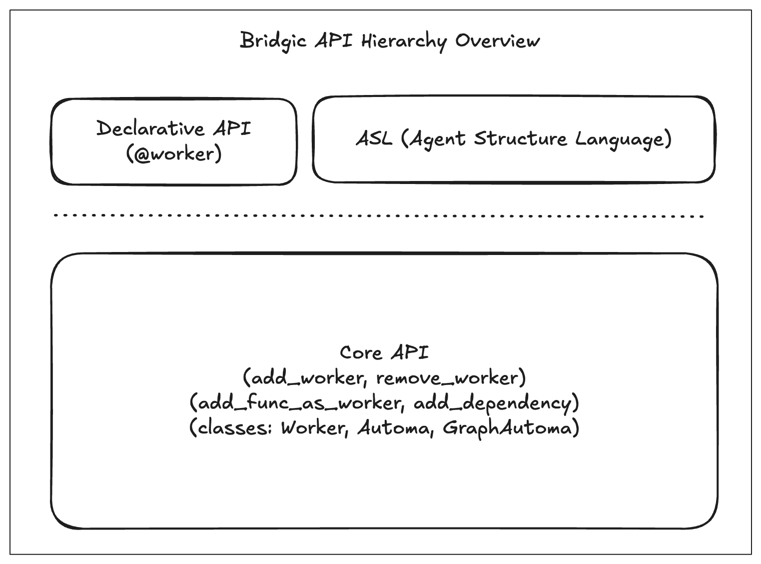 加入ASL之后,Bridgic的编程视图就相对比较完整了。现在我们可以讲一讲Bridgic的API设计层次了。