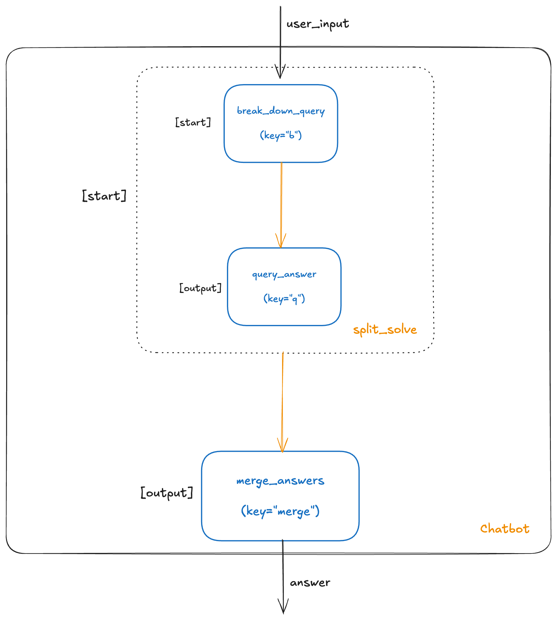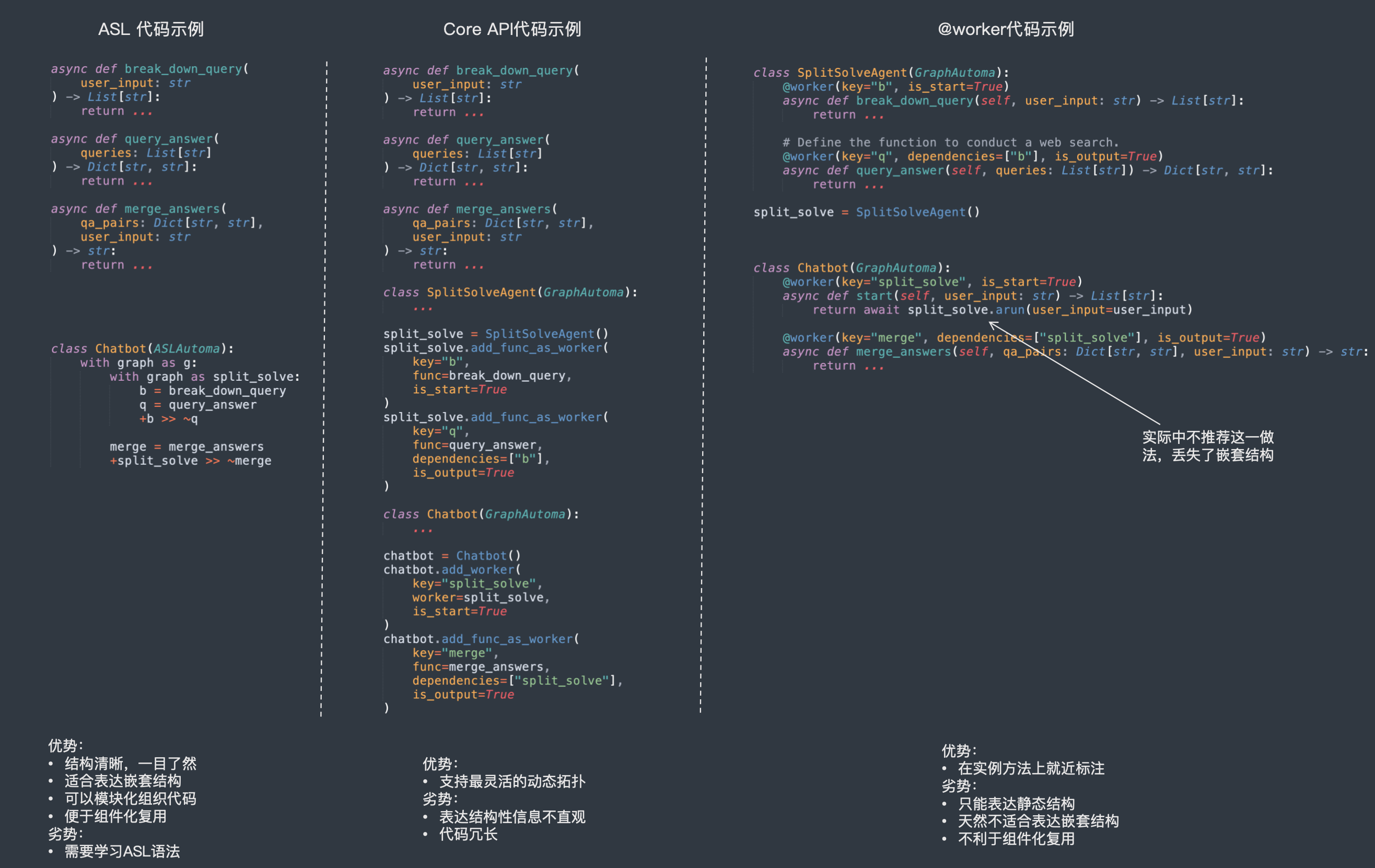 Chatbot。它内部嵌套了一个子工作流,叫split_solve。with graph as split_solve,表示打开了一个子图,名字为split_solve。然后就可以在它上面注册worker节点并指定依赖关系。split_solve内部由两个worker组成,一个是break_down_query,一个是query_answer。前者是把用户输入拆分成子查询,后者是分别回答各个子查询(具体代码可以查看前面的下载链接)。b = break_down_query,表示注册一个worker,并指定唯一的名字 (key) 为 b。q = query_answer的含义类似。+b >> ~q,这个表达式浓缩了很多信息。+b表示它是个start worker,编排的时候它会第一个执行。~q表示它是个output worker,会输出最终结果。>>表示依赖关系,具体到这个表达式,表示b执行完了再执行q。with graph as g,表示打开了最外层的一个图层g。在这个图层里,split_solve被整体当做一个worker来编排。merge = merge_answers,表示在最外层的图层中注册一个worker,并指定唯一的名字 (key) 为 merge。它具体做的事情是,把前面各个子查询的问答数据合并,得到一个最终的答案(具体代码从前面的链接下载)。+split_solve >> ~merge,表示split_solve作为start worker,执行完了再执行merge。而且,merge是个output worker。现在回过头来,再重新对比一下前面的ASL代码和Chatbot的结构图,你会发现,ASL的表达能力已经非常接近于所见即所得 (WYSIWYG) !构建一个智能体,不再需要add_node / add_worker,不再需要add_edge / add_dependency,这些看起来奇奇怪怪的调用统统都可以不要了!真的是一眼秒懂💡