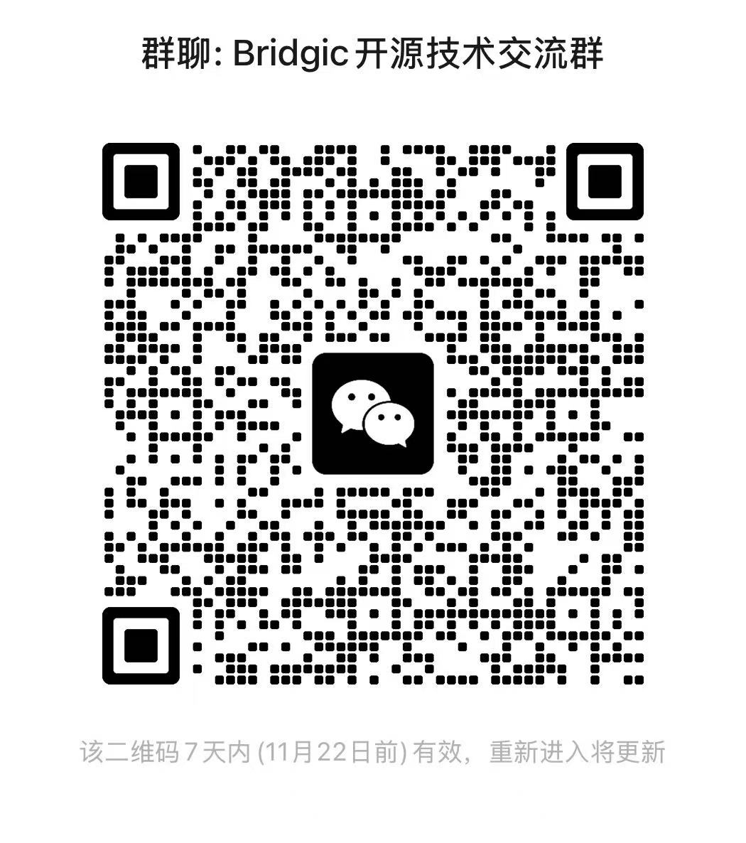 我新建了一个“Bridgic开源技术交流群”,后面会在群里发布项目的开发进展及计划,并讨论相关技术。感兴趣的朋友可以扫描下面的二维码进群。如果二维码过期,请加微信ID: zhtielei,备注“来自Bridgic社区”。