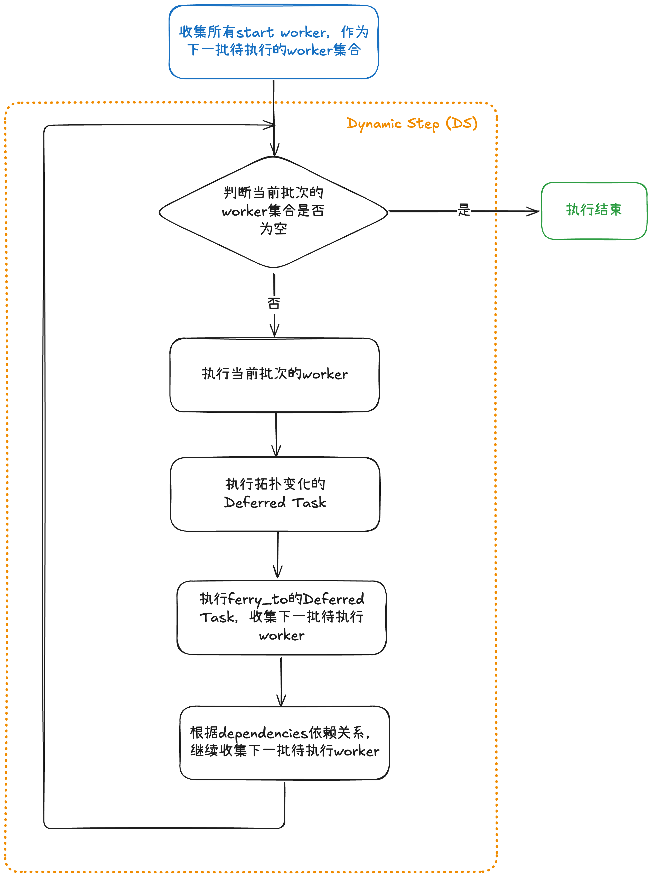 在“执行当前批次的worker”这一步,worker代码被执行,里面可能调用了ferry_to或add_worker。这些调用会创建出对应的延迟任务 (Deferred Task) 。这些Deferred Task在DS的末尾会被执行,它们的执行结果会在下一个DS的调度中生效(也就是对下一批执行的worker可见)。