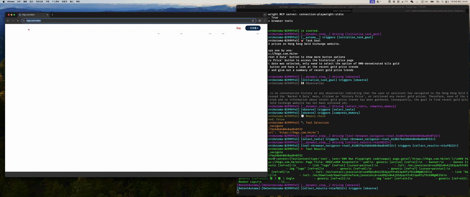 GraphAutoma子类。「原材料」的种类可以根据需要扩展(这是Bridgic对外提供的用于扩展工具的地方)。ToolSpec。它表达了一个工具全方位的信息(描述信息+执行信息),对应有不同的子类实现。ToolSpec经过API to_tool()转换成Tool这个类,表达成了被LLM能够理解的工具形式。这种形式的表达用于与LLM交互,完成工具调用。ToolSpec经过API create_worker()转换成了Worker。Worker被动态加入到GraphAutoma中,就可以利用Bridgic动态拓扑的编排能力完成执行。GraphAutoma的子类(不管是借助@worker还是ASL声明的),又都可以成为工具的「原材料」。有了长程自主模块ReCentAutoma和MCP工具,我们就可以组合出很多自主性的智能体。下面举一个浏览器自动化的例子。一般来说,浏览器自动化的任务需要让模型理解页面内容,很容易撑爆上下文窗口,因此对于记忆的管理和压缩就非常有必要。