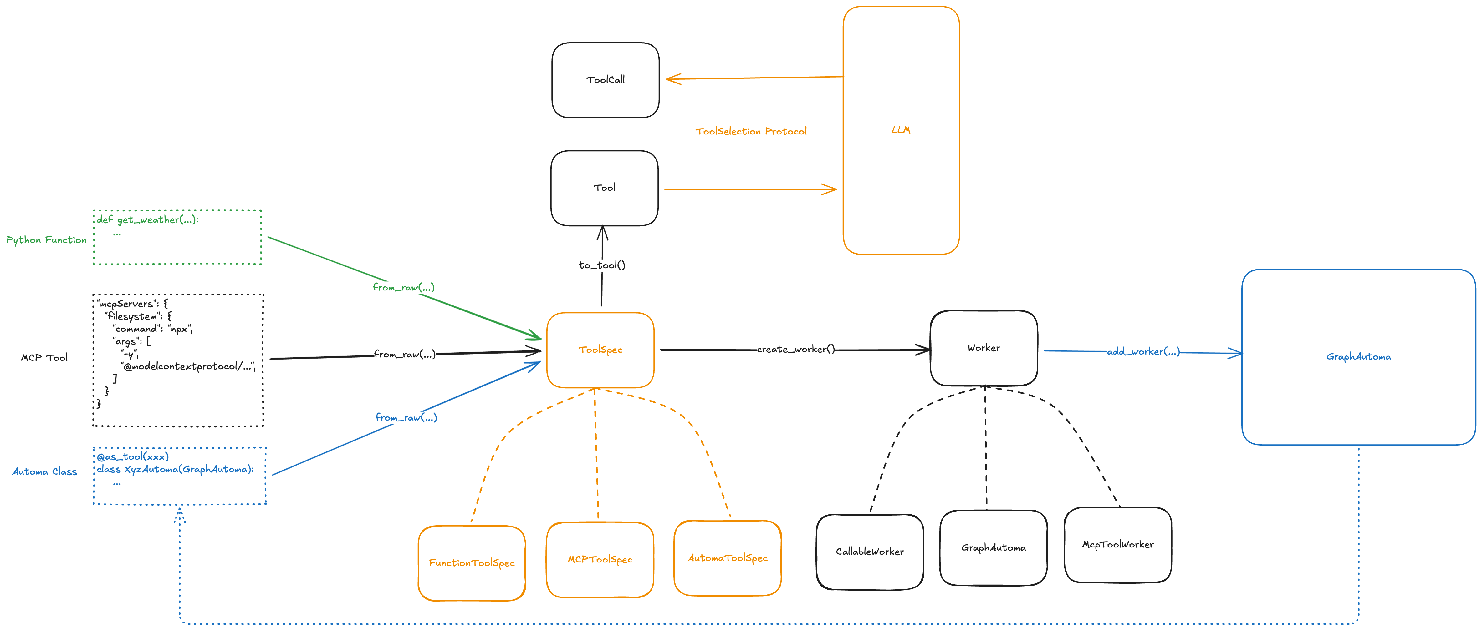 另外,为了让这个自主性模块能够与市面上现有的工具更轻松地对接,Bridgic这个版本对MCP集成的能力也进行了完善(引入了ToolSetBuilder)。至此,Bridgic的「工具架构」已经自成体系,可以用下面的图来表达(点击看大图):