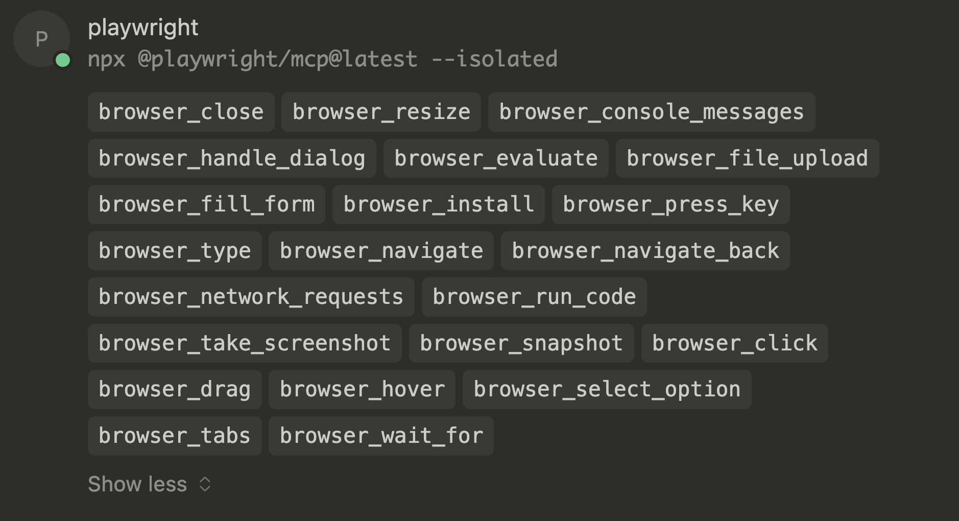 在这个例子中,我们选择Playwright提供的MCP工具[4]。如下,当前共有22个工具。