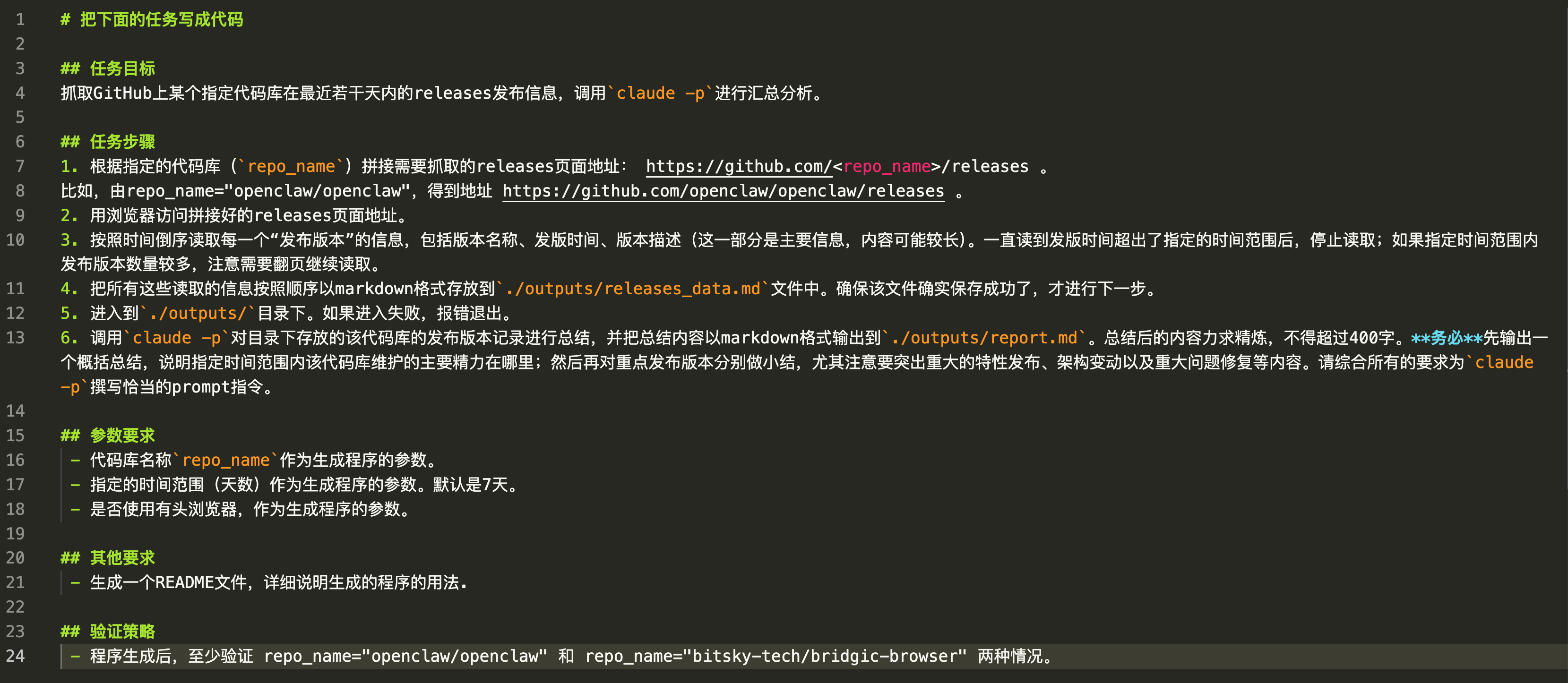 我们建议的做法,是把自动化任务描述成自然语言,存到一个名叫task.md的markdown文件中。类似下面这个样子: