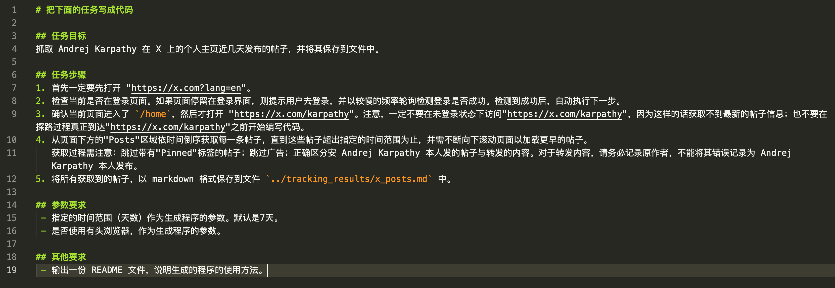 下面录制了一个探路+代码生成的例子。它的主要功能是到Andrej Karpathy的X (twitter) 主页上获取最近一段时间的动态(中间涉及登录过程)。task.md内如如下所示: